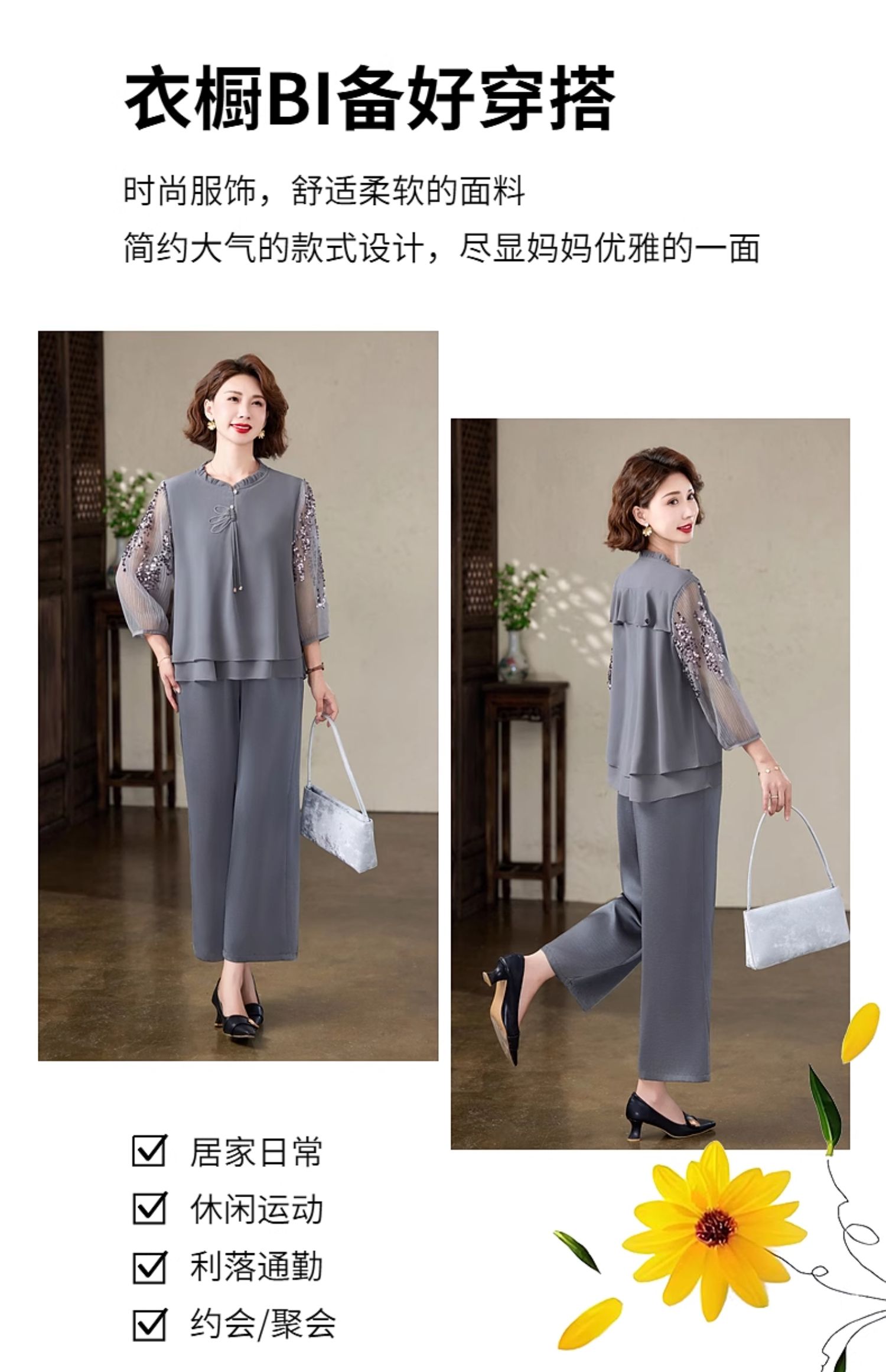 中老年女夏季雪纺阔腿裤两件套母亲节衣服